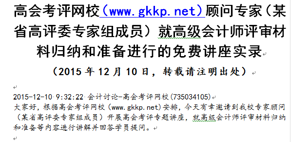 评审成功靠什么?!高会考评网校(www.gkkp.net)顾问专家(某省高评委专家组成员)在我校邀请下,就高级会计师评审材料归纳和准备进行的讲座实录(29页),欢迎下载!http://www.gkkp.net/