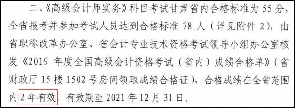 甘肃省财政厅发布了《2019年甘肃高级会计师考试成绩合格标准通知》,甘肃2019高会考试达到全国合格标准的考生成绩有效至2022年12月31日;甘肃2019年高级会计师省内合格标准为55分,合格成绩在全省范围内2年有效,成绩有效至2021年12月31日。http://www.gkkp.net/