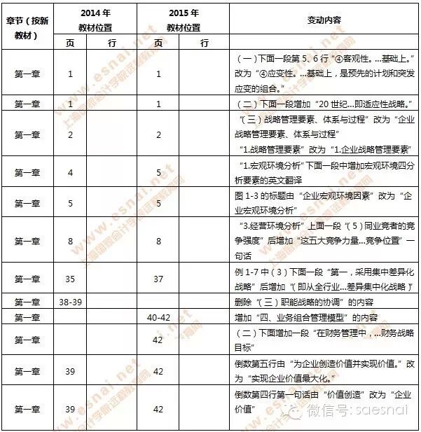 2015年教材结构体系没有发生变化,主要是在第一章中新增了波士顿矩阵和SWOT模型,第九章新增合营安排一节的内容,其他内容根据新准则略有调整和完善,第十章政府收支分类根据《2015年政府收支分类科目》调整。其他章节都是一些小的调整。http://www.gkkp.net/